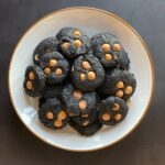 I have been driving all over town lately looking for the new Lily’s Pumpkin Spice Baking Chips. Several stores listed them as in stock but upon arrival, alas they were not. Oh well. My dream of black pumpkin spice cookies for the moment is not to be… but for you, maybe! Instead, I used Lily’s Butterscotch chips and am extremely pleased with the results. They taste how I feel Halloween should! They are also kid and grandpa approved (the latter one is a BIG deal as my father rarely puts anything in his mouth he doesn’t know he will enjoy… and my keto treats are suspect. He also does not like chocolate so I had to assure him they were not! The dark color comes from using black tahini! They are so yummy. And since I have trouble still with coconut flour for some reason (uh… carb sensitivity!) they are also free from that as I use sesame flour. Keto and paleo flours are tricky to work with so I rely on scoops to dispense my dough. Also they often do not spread out with baking so be sure to press them down before you bake. Even trickier are some of the keto baking chips I have worked with. These have a very low baking temperature to prevent the butterscotch chips from disintegrating… making a bit of a sad mess. But because they are not baked hard, you need to wait at least 10 minutes for them to cool before eating them. (Not that I did!)