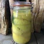 The first time I experienced preserved lemons was during one of my trips to Morocco in my young explorer days. They add depth to dishes and are eaten skins and all. Fermenting takes the bitterness out of many vegetables and it is true of some fruits as well. The flavor profile is a bit like a not so sweet lemon sour patch kid. They are so tasty and addictive! Most people rinse the salt off of them before eating but as I can blame my E.R. trip on low sodium levels I have been eating them simply cut up over my fish and avocados.